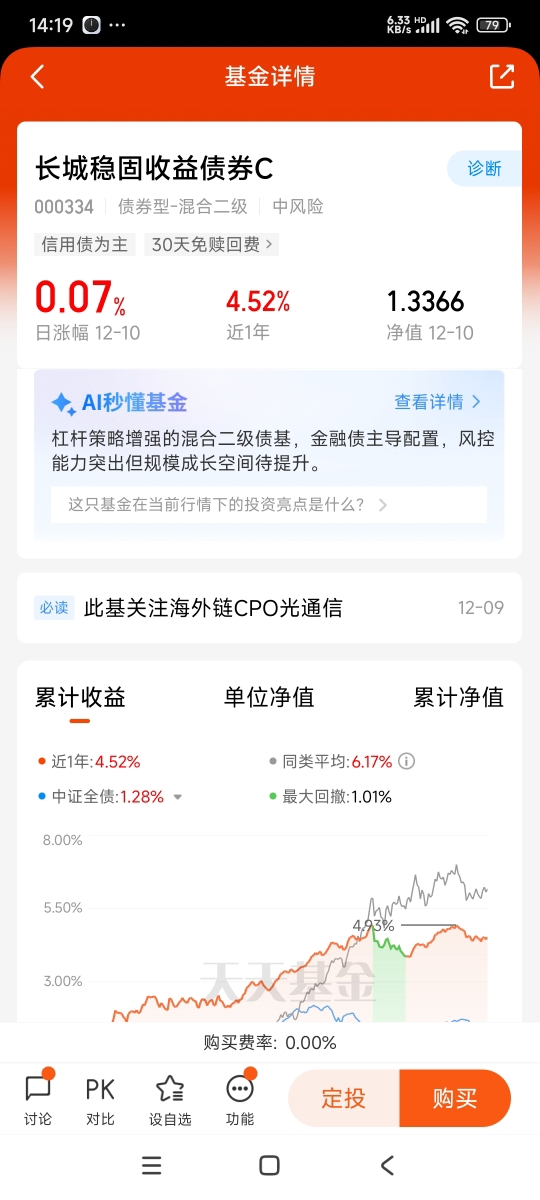 【长城稳固收益债券C 000334】年化收益率4.52%,明显高于很多纯债。配置的股票占比仅有2.99%,在债券稳健的收益中,争取增强收益!和某些大起大落的股基比,稳中有升的策略才更适合当下行情,适合稳健能接受一点波动的人群选择。