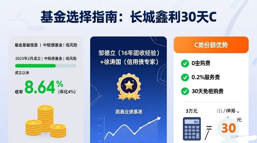 作为理财小白,我选基金先看“底子”——长城鑫利30天C是2023年2月成立的中短债基金,属于低风险类型,核心投资1-3年期限的中短期债券,不碰股票、可转债这些高波动资产,安全性拉满。截至2025年12月,最新净值1.0864,成立以来收益率8.64%,相当于年化4%左右,比一年期定期存款还香!
