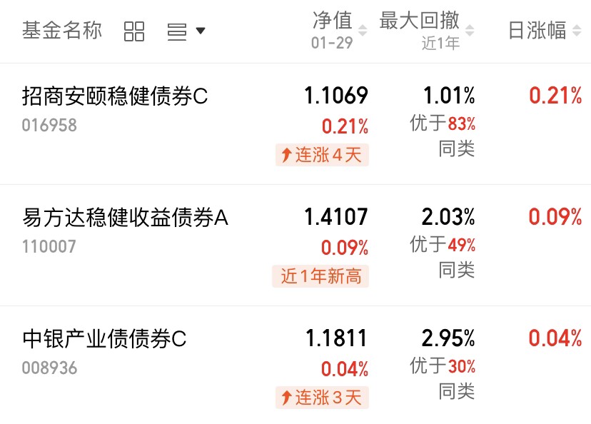 偏债基金的风险等级很适中,既不是高风险的类型,不会让本金面临大的波动,也不是低收益的品类,能兼顾到一定的收益空间。这种不偏不倚的特性,适配我的理财需求,$招商安颐稳健债券C(OTCFUND|016958)$昨日上涨0.21%。