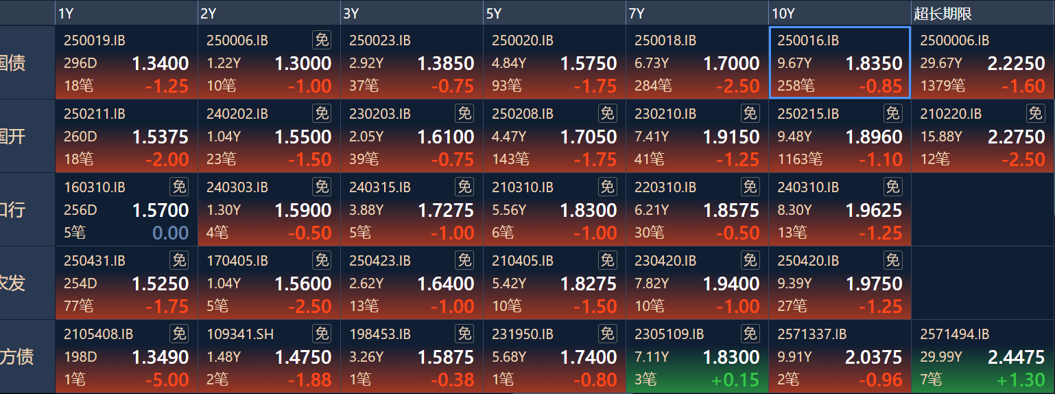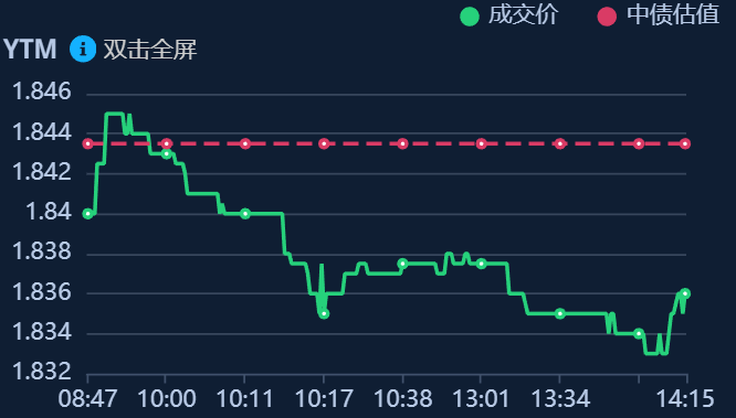 二、十年期国债收益率:1.836 -0.0075%(国债收益率越涨,债市越跌,两者反向关系)