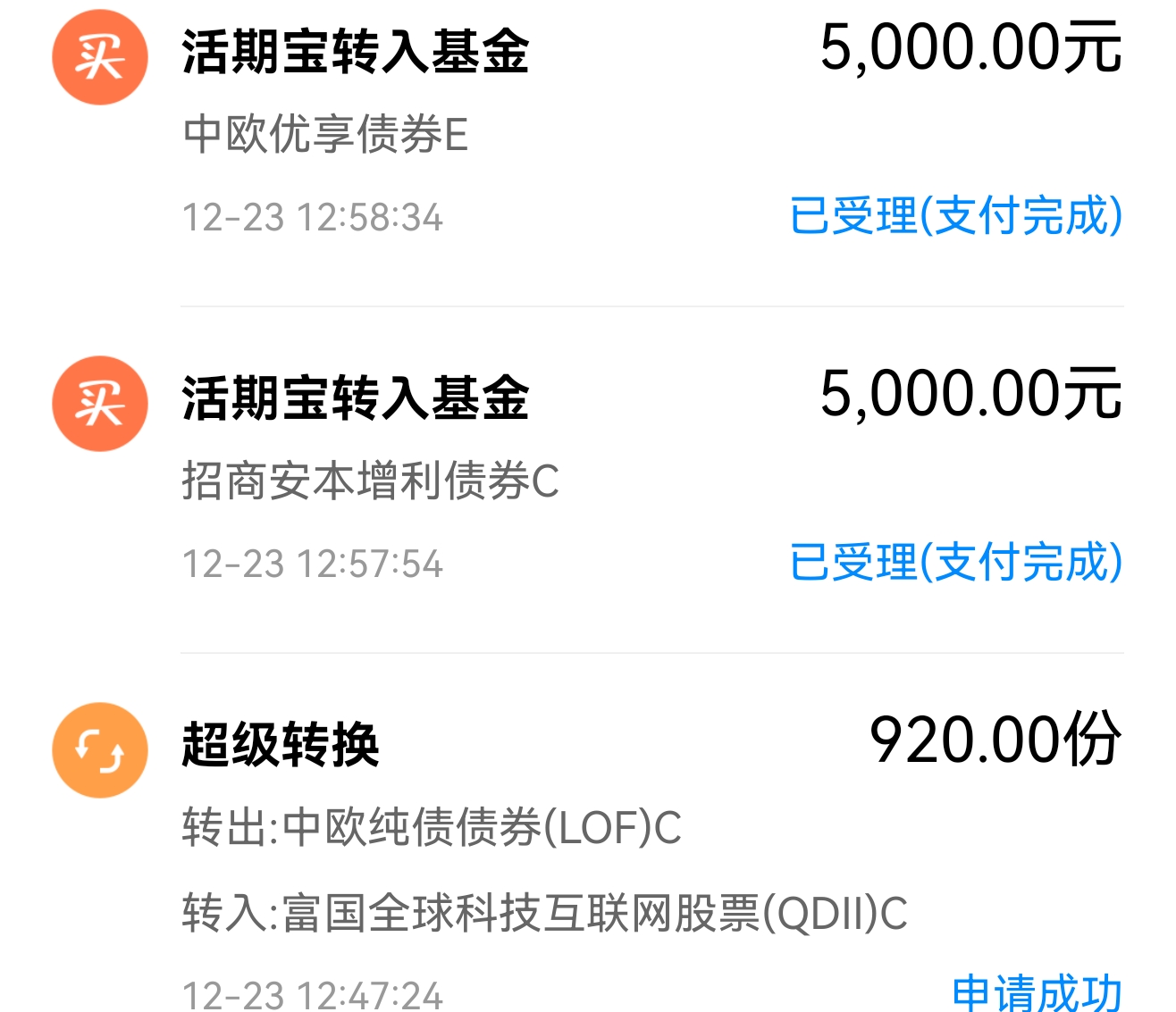 (1)由于信用债滞后特性,今日信用中短表现一般,那么很适合继续布局中短端,在股债震荡环境中,安全垫一定是少不了,增加资产安全边际,平滑账户收益,$中欧优享债券E(OTCFUND|023977)$主要以高评级信用债为主,不做信用下沉,稳定的票息收入,波动率相当低,走势平稳,上周震荡调整也能够控制不碎蛋,属于是不操心一类产品了,近一个月表现也是非常优秀的,收获14枚蛋,同策略平均水平还处于负收益,表现突出,目前E类属于7免债基,灵活性高,比起中欧优享这类短债,银行定存时长较为受限,收益率也要高些,所以这里也算是家庭闲钱好去处,个人继续加大仓位。