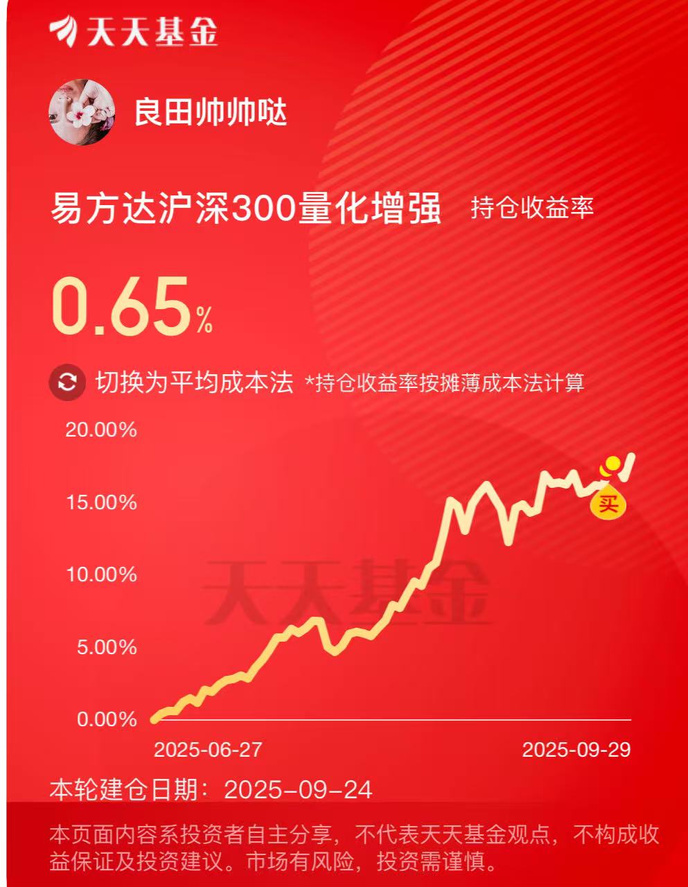 我今天投一次沪深300指数增强基$易方达沪深300量化增强$ 目前,新入不就,这个还是表现还是很给力的。沪深300指数是我长期定投的方向,主要原因这是价值投资的代表。此外,这只基除了跟踪沪深300指数外,还会通过A1+选股获得超额收益,这是我非常看好的。现在A股正在走慢牛,按策略继续定投。