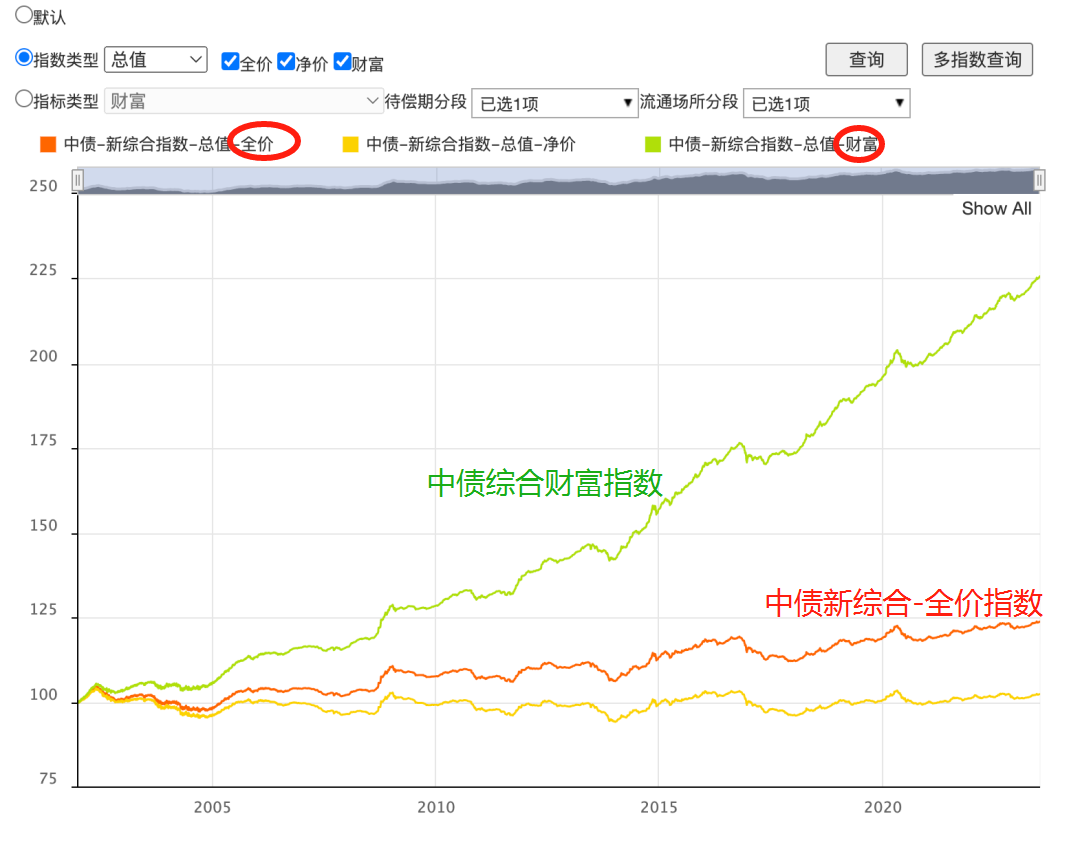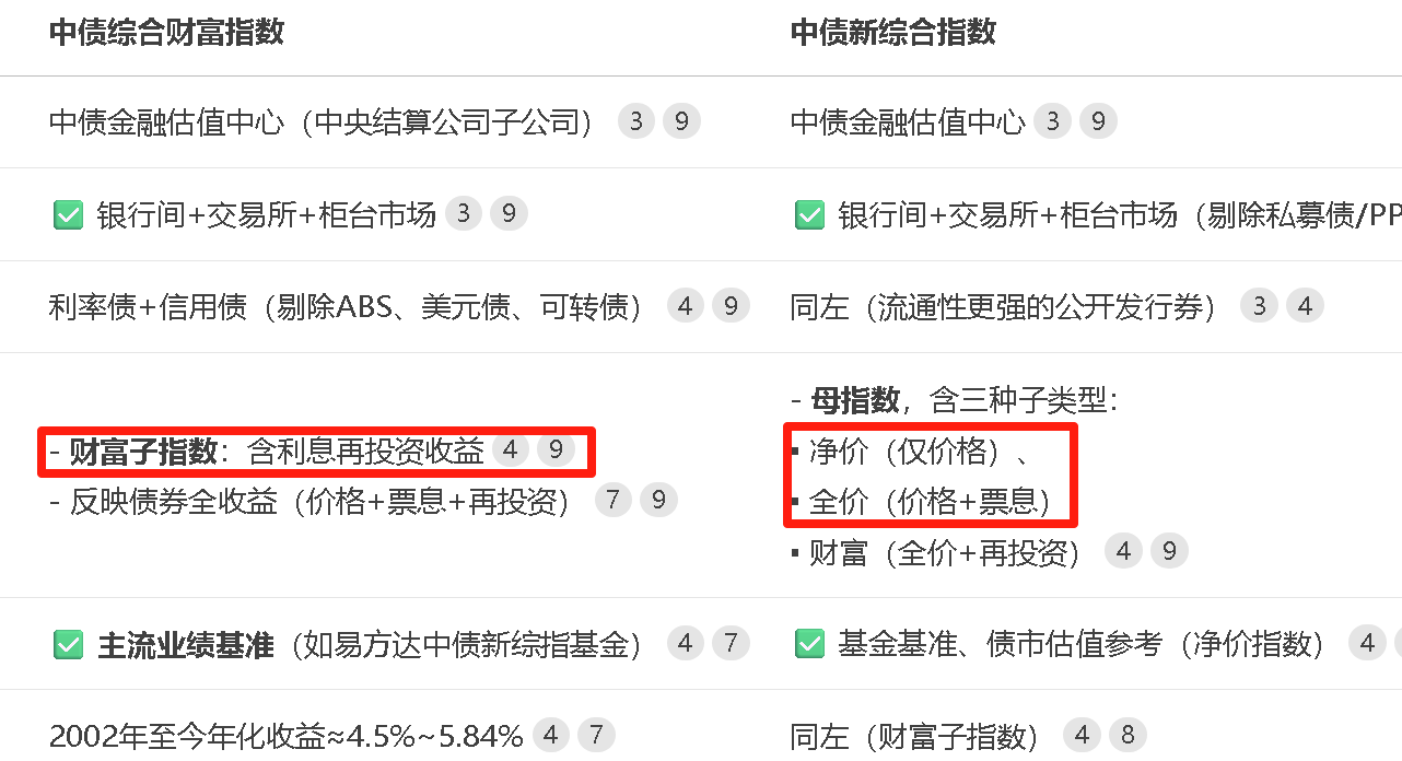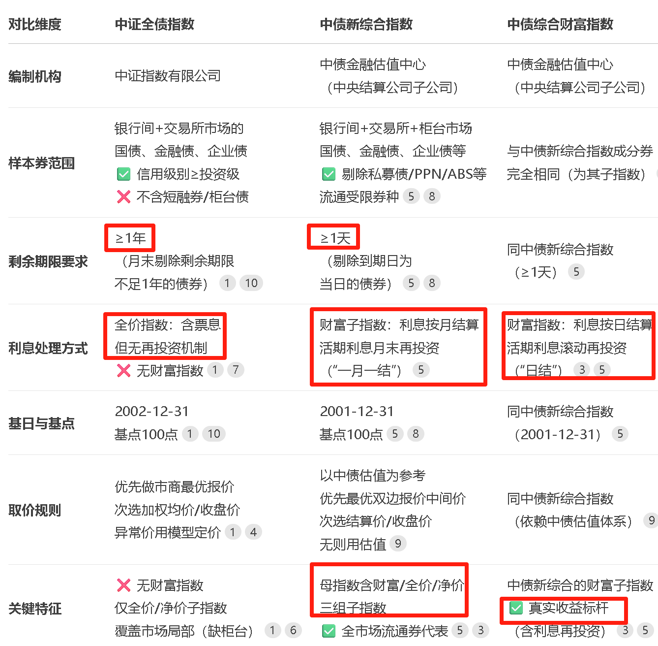 中债综合指数系列没有提出1年以内的债券,覆盖更全面。其中的中债综合财富指数包含了利息按日结算再投资收益。