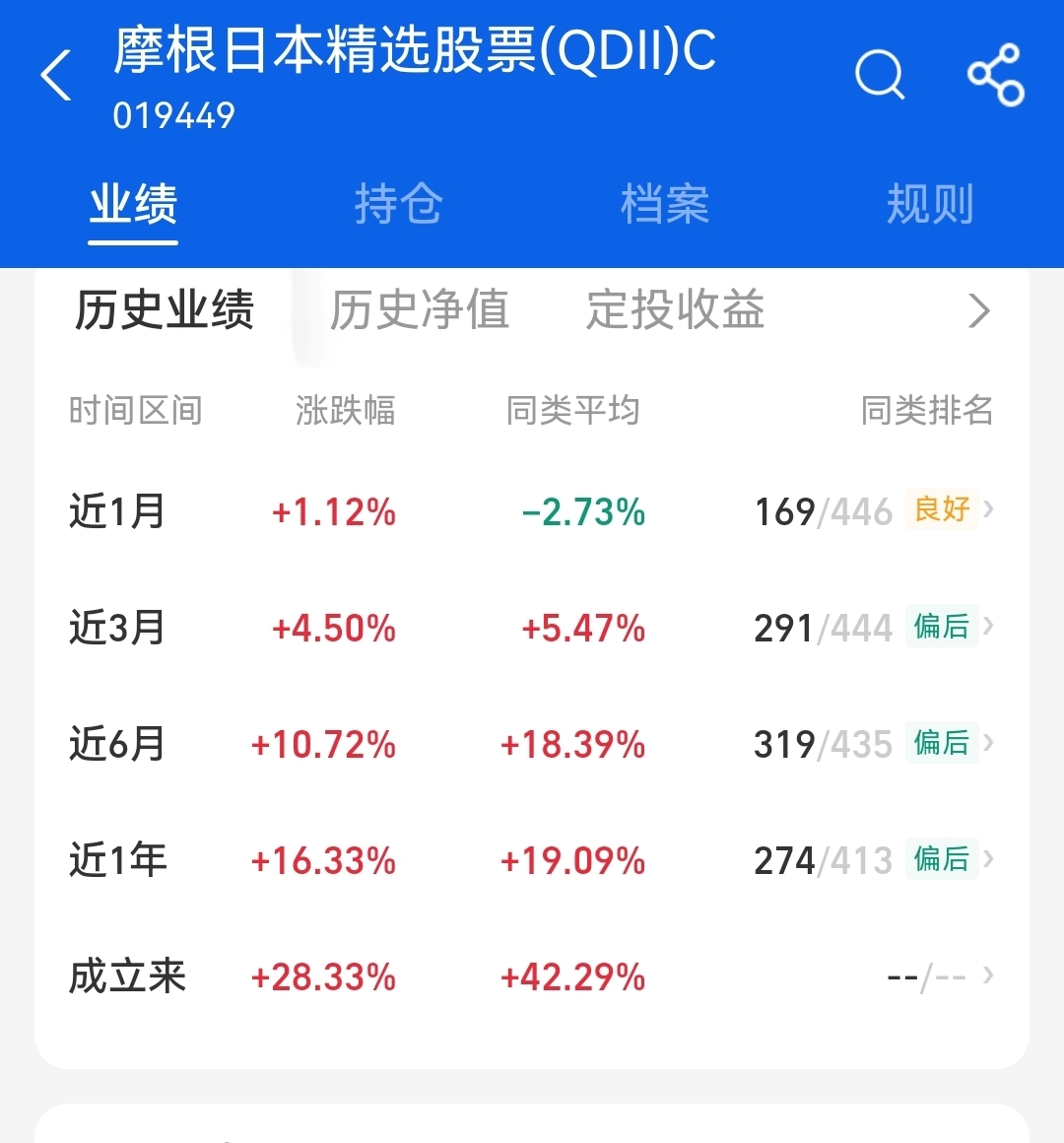 新的一周,布局新方向,今天a股三大指数震荡走势,不过近期看日元汇率企稳,日本股市表现还是很亮眼的,关注的摩根日本精选股票(QDIIC近一年涨16.33%,走势稳健,近期都是小跌大涨的,聚焦的日本优质股票,精准捕捉当地经济复苏和企业成长机遇。不管是科技巨头还是消费龙头,都在它的持仓范围内。此时布局,后续吃肉可能性更大!