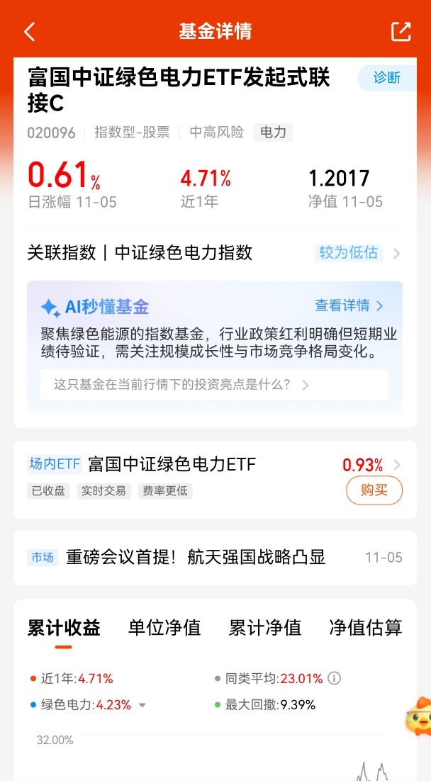 手里有半导体C,也搭了点绿色电力C,AI算力爆火推高用电需求,这基金跟踪误差仅0.24%,老将掌舵,近1月涨6%,估值还比五年里六成时间都便宜。