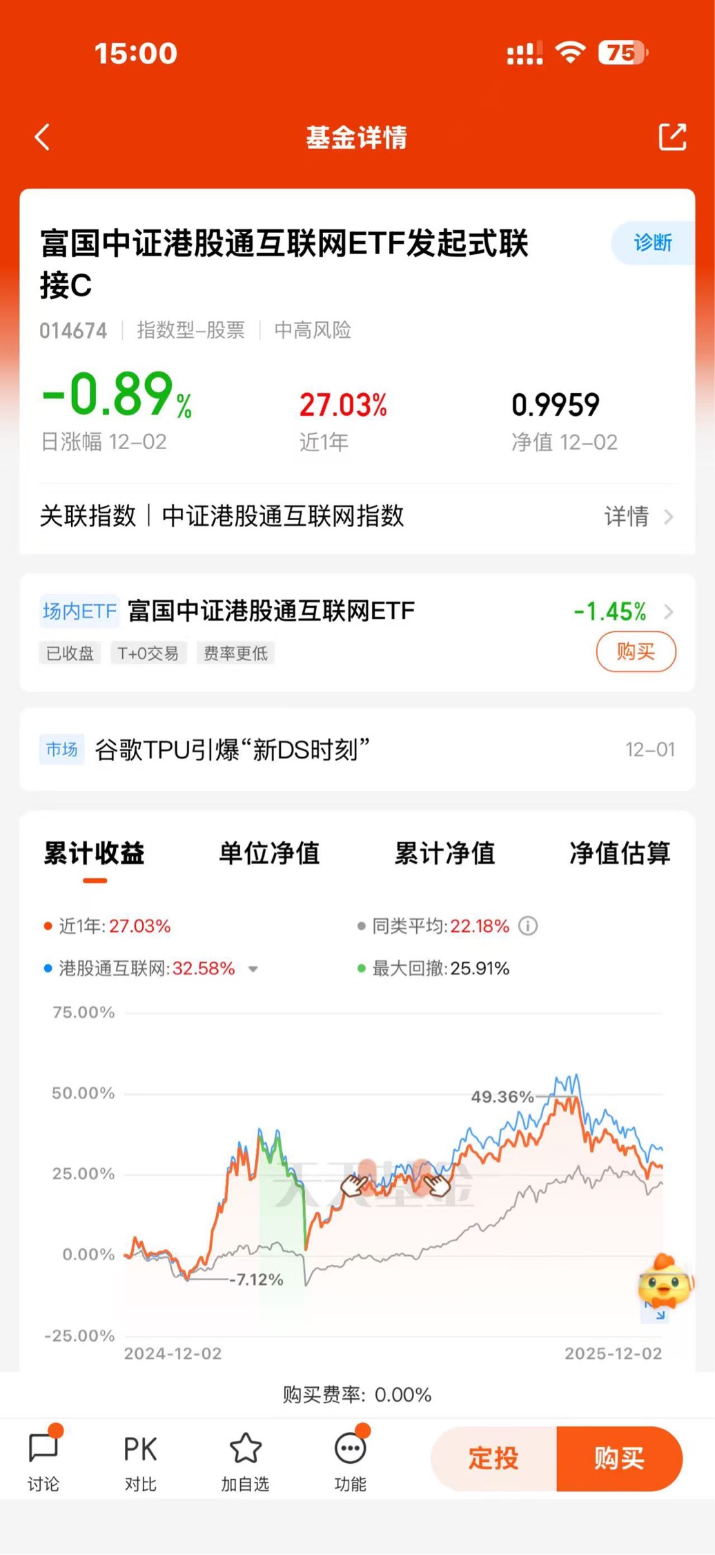 最近半导体那块一直没动静,倒腾了些仓位到富国中证港股通互联网ETF联接C,它盘子