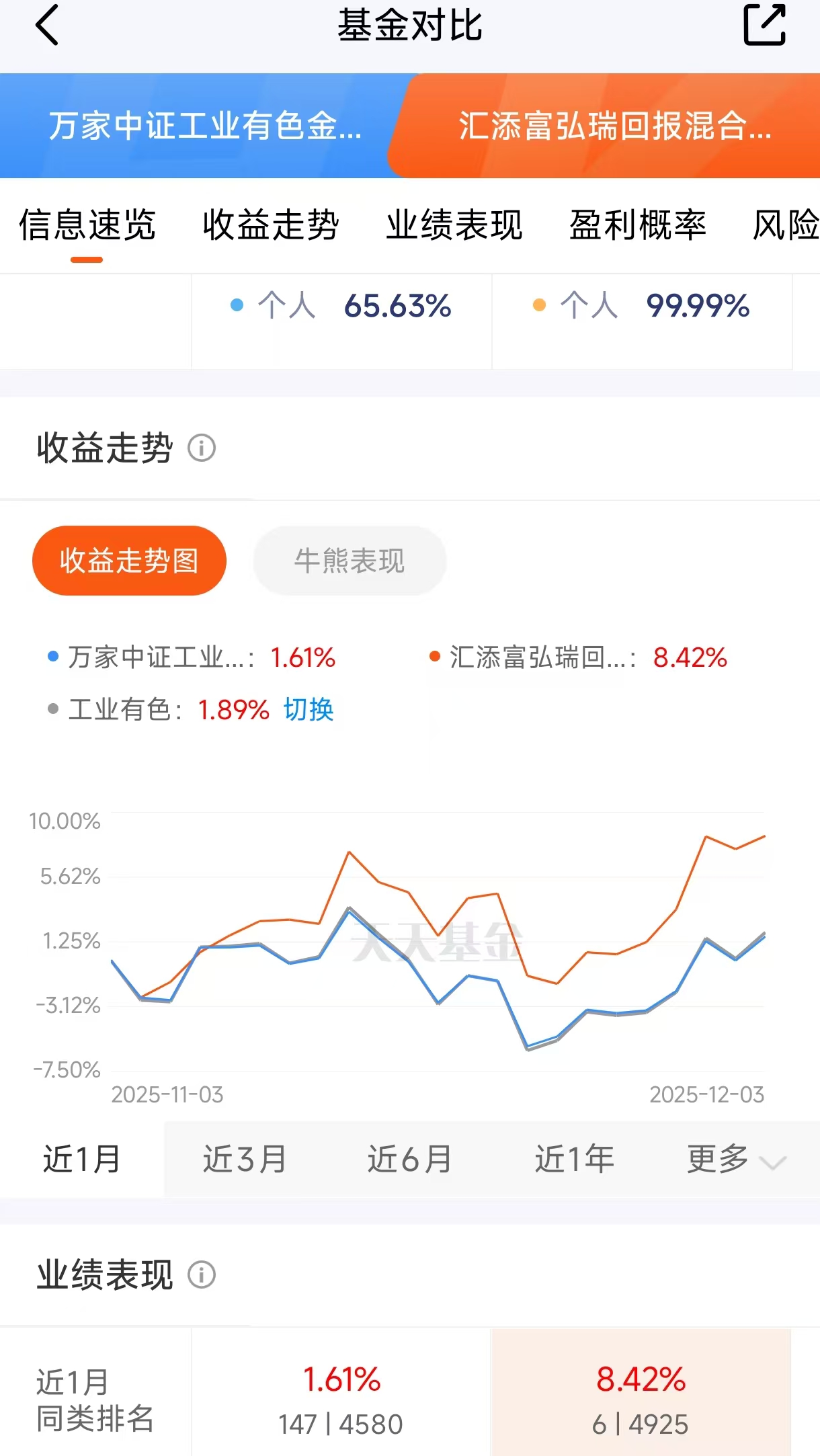看LME铜又在创新高,今天还继续涨,我买了几个有色基金,表现最好的是$汇添富弘瑞回报混合发起式C$(022321),这基金近一个月涨8.42%,同类万家中证工业有色金属A(018489)就只涨了1.63%,差距还是很明显的。有时候你看对板块还不一定能挣钱,还得看对基金。要我说做有色,就是做汇添富弘瑞。#12月你看好哪条投资主线?#