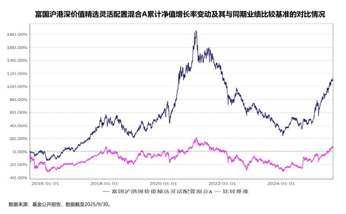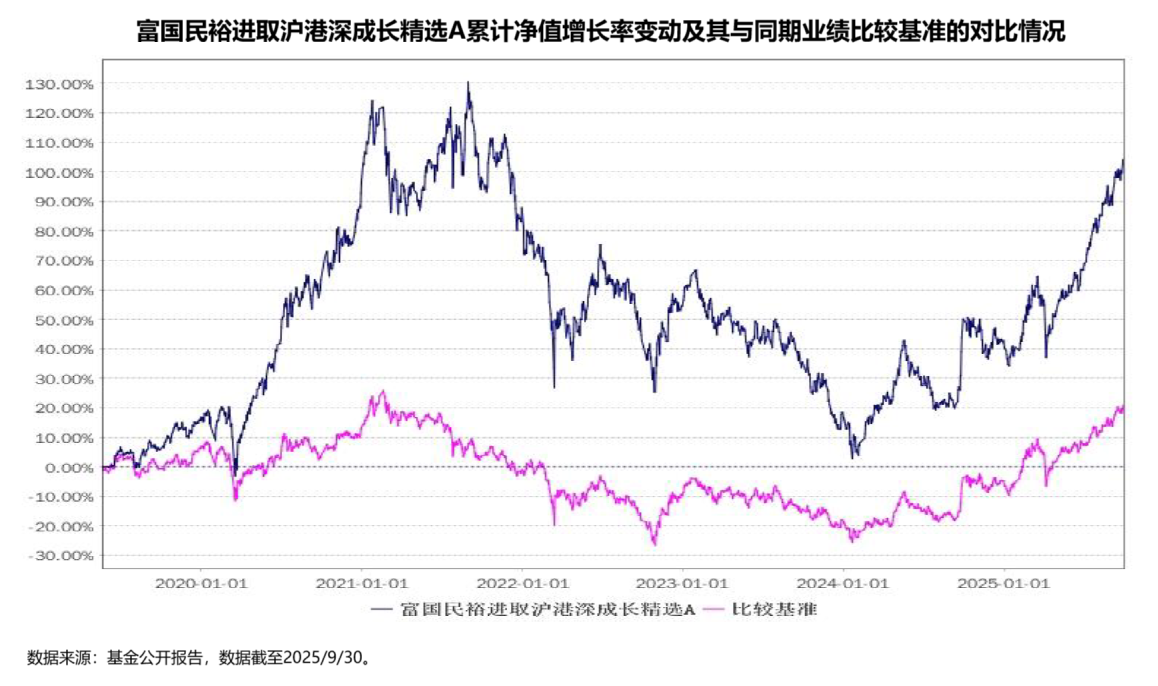 以其管理时间超过5年的富国民裕沪港深精选为例,截至2025年9月30日,该产品近一年的收益率为36.13%,拉长时间来看,截至最新,成立来收益率接近翻倍,年化回报超10%。