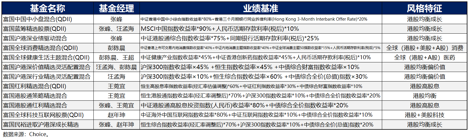 比如泛投资港股宽基的话可以选择富国中国中小盘、富国蓝筹精选、富国沪港深业绩驱动、富国港股通策略精选、富国民裕沪港深精选等整体风格偏均衡成长的产品;
