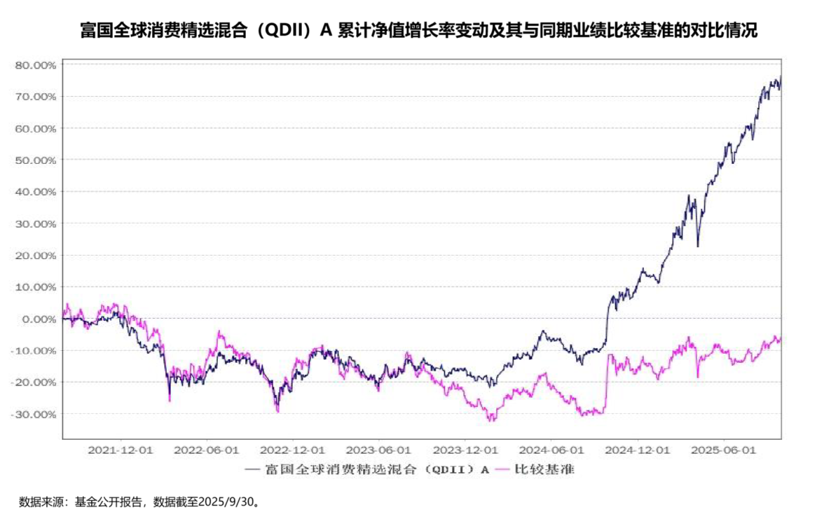 截至2025年9月30日,该产品近一年收益率为75.39%,近三年的累计收益率为64.97%。Wind数据显示,富国全球消费精选在彭陈晨任内涨了63.33%,任职期间的年化回报达12.97%,位列同类排名第1(1/59)。
