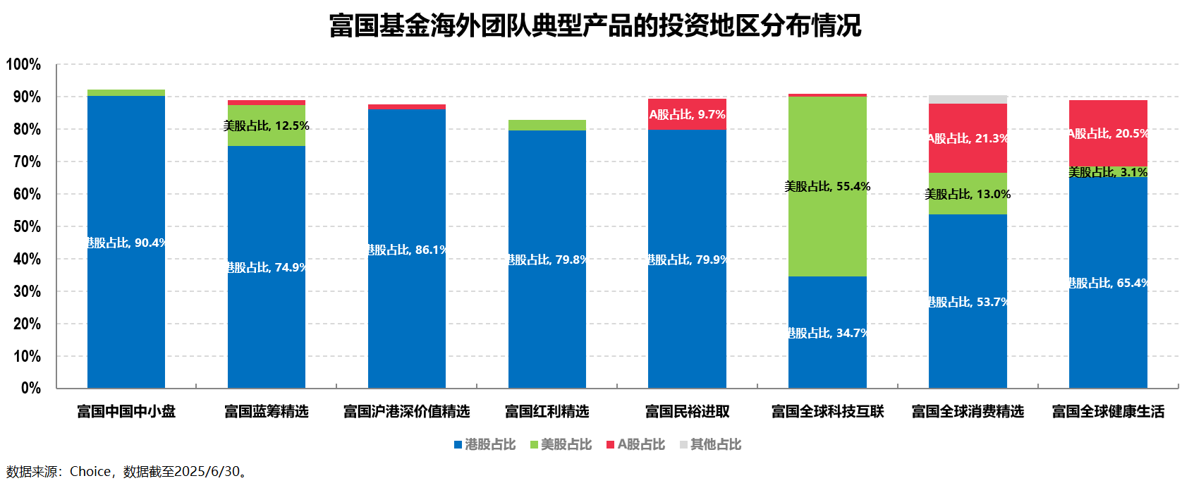 上图则是富国基金海外团队典型产品的投资地区分布情况。产品主要以港股市场为主,同时也兼顾了美股市场和A股市场。