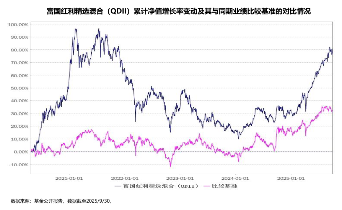 另一只代表产品则是其管理超过6年的富国蓝筹精选,截至2025年9月30日,该产品自2019年8月2日成立以来的累计总回报为242.45%,折合年化收益率为22.09%;近一年的收益率高达74.82%,排名同类第一(1/73,数据来自银河证券,同类为QDII基金-QDII股票基金-QDII股票型基金(A类))。