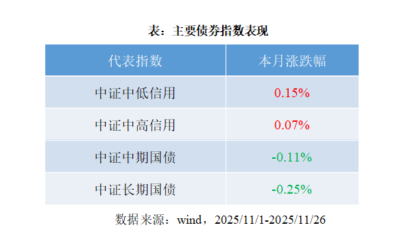 A股资产:2025年11月,A股市场整体呈现回调态势,主要指数均录得负收益,万得全A下跌2.96%(截至11月26日)。宏观经济弱复苏与外围不确定性交织,叠加年底机构资金避险情绪升温,市场风险偏好下降。本月各个行业表现分化显著,防御性板块(如石油石化、食品)与政策支持领域(如传媒、商业航天)相对抗跌,而科技成长板块(如电子、电气设备)承压明显。货币政策维持适度宽松,但边际效率减弱,降准降息预期降温。总体看当前市场行业轮动速度加快,主线震荡,业绩空窗期及年末止盈压力下,短期预计指数将维持震荡态势,各方向轮流表现,依旧建议维持组合的均衡,不追高短期涨幅较高的成长方向,以红利底仓+均衡成长的配置结构应对市场。