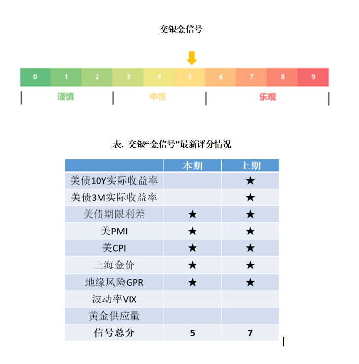 交银投顾最新的黄金投资信号为5分:包括美债期限利差、美国PMI、美国CPI、上海金价格趋势、地缘风险等5个维度因素继续保持看多。