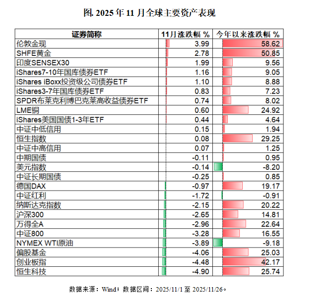 2025年11月,全球大类资产出现大幅调整,尤其是权益、商品等高风险资产,跌幅居前。