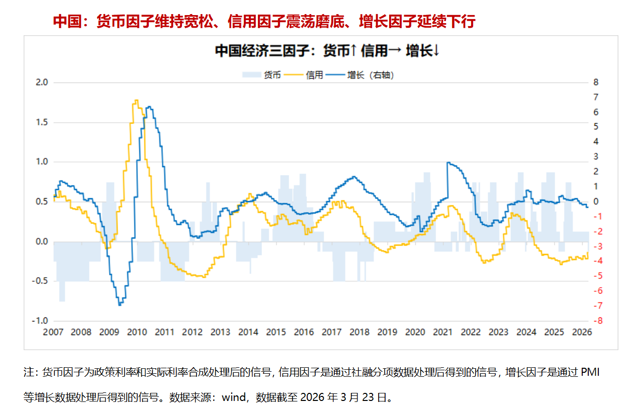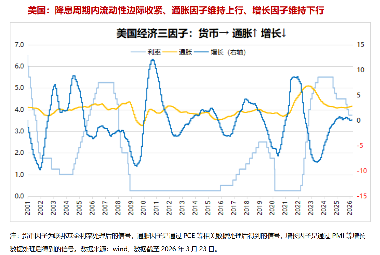 美国货币因子:3月FOMC继续暂停降息,市场流动性预期大幅收紧。3月FOMC会议继续暂停降息,投票以11比1的共识结果通过,点阵图显示预计2026年降息次数多余1次的委员人数减少至5人。尽管联储的表述比较客观理性,表示当前能源供应冲击是一次性事件,目前判断油价上涨是否蔓延到整体通胀还为时过早,但是市场对于流动性收紧预期的演绎比较极致,近期美债利率大幅上行,已经隐含了本年的加息预期。