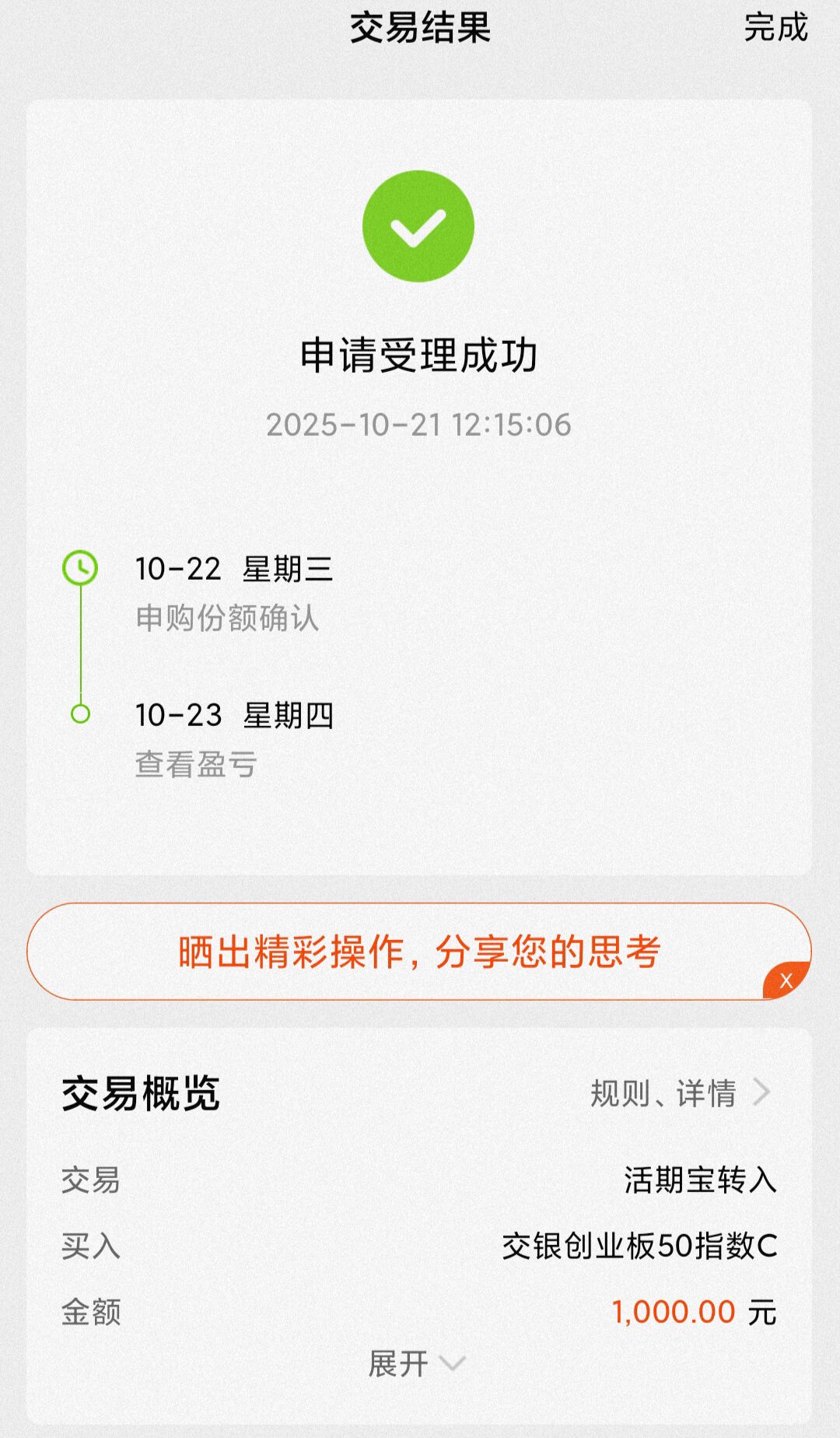 到目前为止,交银创业板50指数年涨幅超43%,多阶段表现优秀,经过前几天的回撤后这两天A股明显拉升,上证指数重新突破3900点,感觉是一个不错的信号,我今天决定加仓1000元该基金增大仓位。