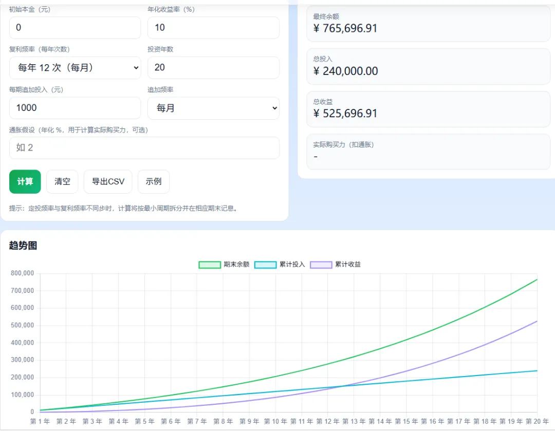 假定初始0元,下个月开始,每个月定投1000元,未来20年每年可以取得10%的复合年化回报率,则: