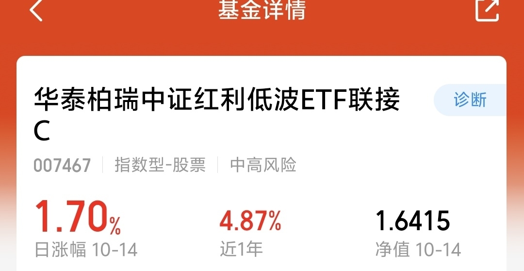 $华泰柏瑞中证红利低波ETF联接C$ 今天继续发力,涨幅1.70%,这已经是第四天上涨了。在波动行情中,这样的防御资产真是让人省心。