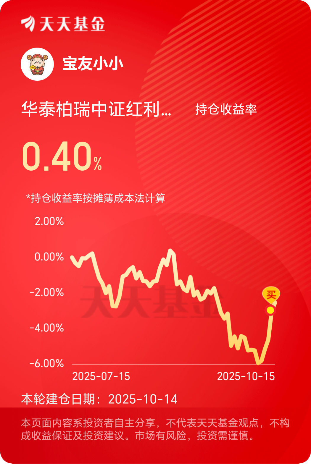 #晒收益# 红利指数近期强势回归,$华泰柏瑞中证红利低波ETF联接C$ 连续第五日上涨,今日涨幅0.48%。这验证了其在市场调整后防御价值的再次提升。