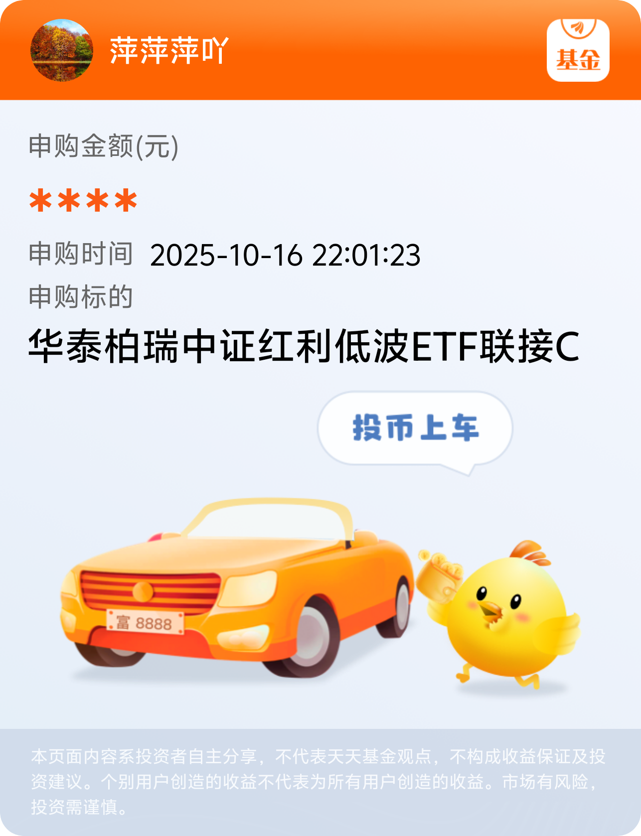 #晒操作# $华泰柏瑞中证红利低波ETF联接C$ 今天继续上扬0.56%,实现六连阳!听说资金都在涌入这类资产,跟着da资金走果然没错。