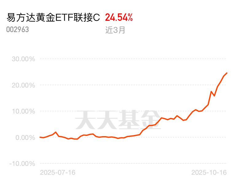 谁还没盯黄金?金价创今年最大涨幅,牛市来了。易方达黄金 ETF 联接 C 今天涨 3 个点,近一月 15.09%,近一年 55.21%,同行里突出,博弹性选它。$易方达黄金ETF联接C$