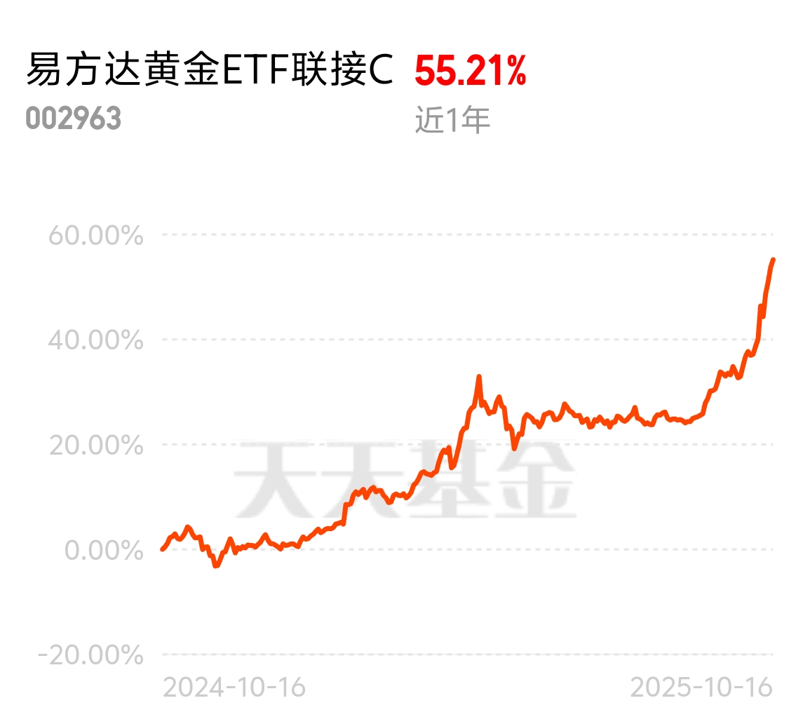谁还没盯黄金?金价创今年最大涨幅,牛市来了。易方达黄金 ETF 联接 C 今天涨 3 个点,近一月 15.09%,近一年 55.21%,同行里拔尖,博弹性选它。