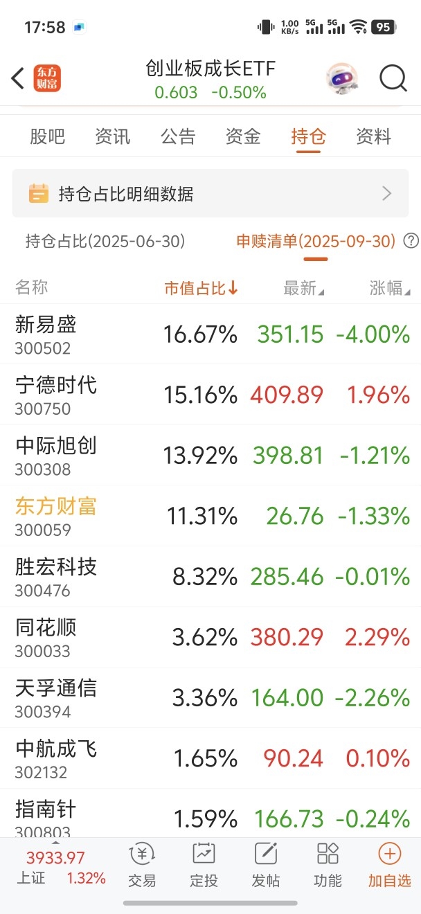 价格低点时候卖了汇川技术,几十块钱的中际创旭也卖了,现在又高位接盘新易盛和300多的中际创旭,近一年跑输创业板指数20个点,追涨杀跌,就这还好意思叫成长?管理费比创业板贵多了,当初真是瞎了眼选了你,别人小跌它大跌,别人微红它小跌,拜拜了您嘞,接盘鸡