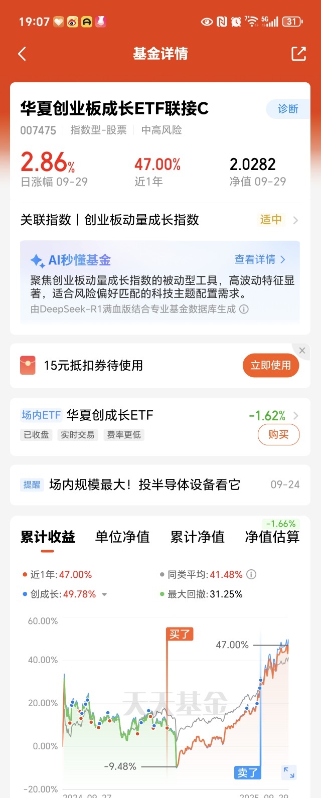 #分享国庆见闻,晒收益,瓜分好礼!#国庆来了,叠加中秋,但是感觉没有往年热闹。朋友们都说消费好难,股市虽然在上涨,但是距回本还有一定的距离。后续大概会继续,稳步卖出。$华夏创业板成长ETF联接C$ 之前套了很久,终于解套。腾挪出来的资金可以买其他板块,很开心。后续会关注消费!@华夏基金