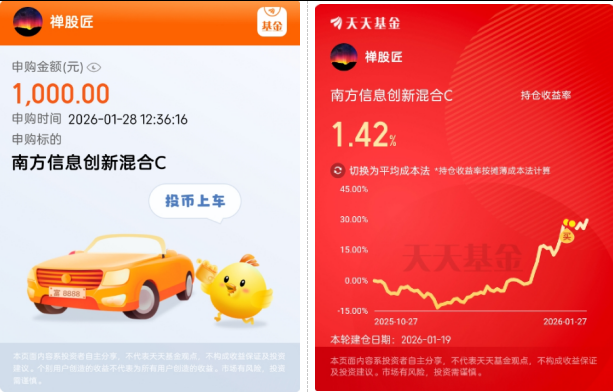 刚加仓的$南方信息创新混合C(OTCFUND|007491)$,就有正收益啦!昨日净值涨3.26%,这涨势太猛,必须接着加!节前仅12个交易日,春节前的红包值得期待。春晚满满的高科技元素,节后或有惊喜!