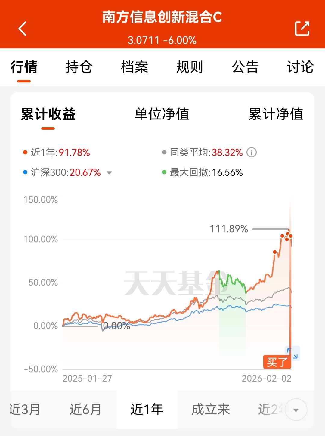 半导体板块今天盘中有些震荡,并且多次翻红上涨,说明经过昨天的大幅度调整,风险已得到了充分的释放,接下来有望稳定下来,并且逐步向上修复。一方面,存储芯片当前处于涨价周期,有利于相关产业链业绩提升;另一方面,半导体板块内公司2025年业绩预告普遍超预期,有利于提升投资者信心;再加上,AI算力、人形机器人、智能汽车等新兴场景对半导体的需求持续增长,半导体行业景气度有望持续上升。南方信息创新混合C持仓以半导体为主,近一年上涨超过91%,业绩大幅跑赢半导体指数,优势非常明显,趁着昨天的跌幅还没有被修复,我今天继续加仓。