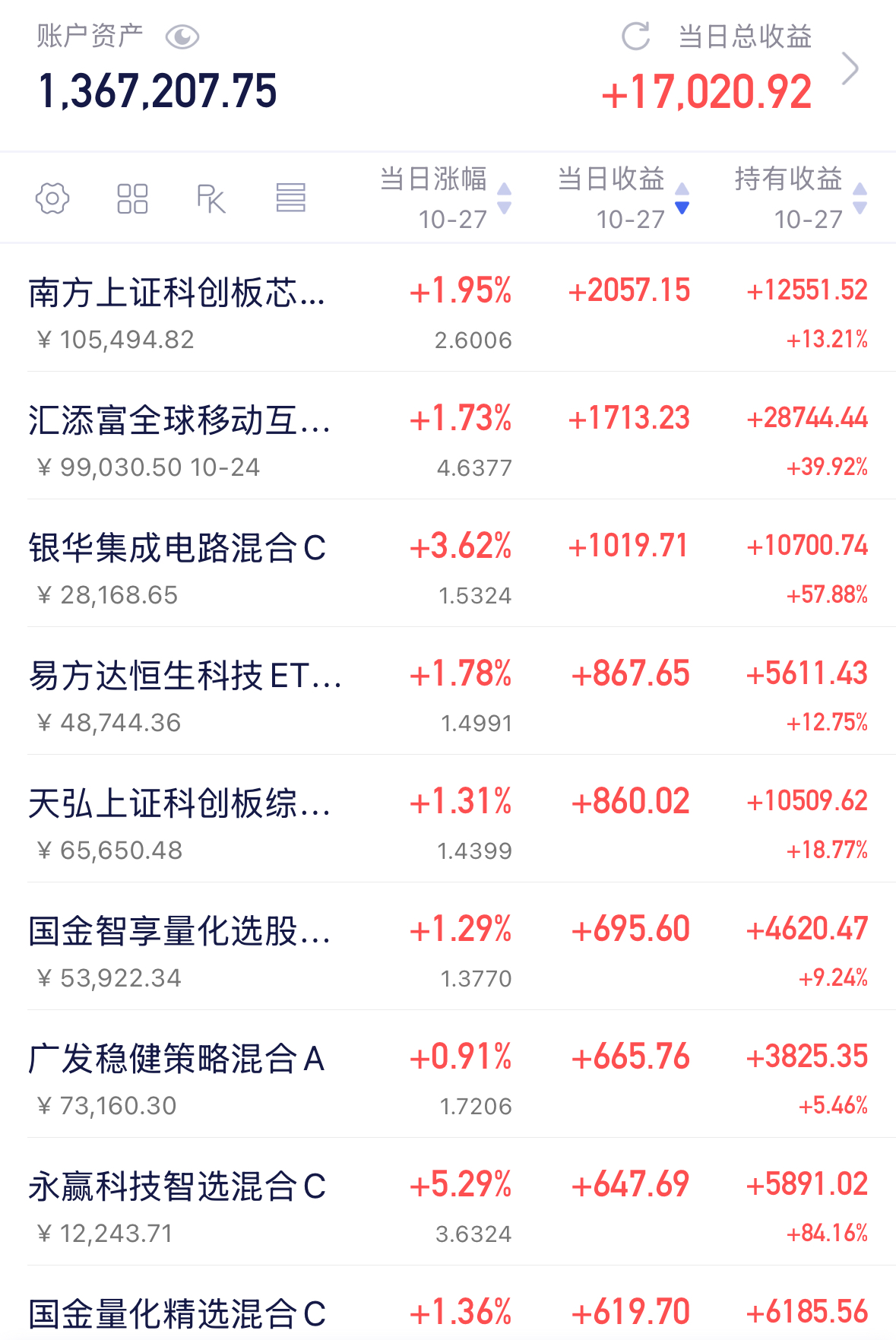 要新高的节奏啊,上周五大涨5%+,今天盘中又是2、3个点的节奏,近6月已经涨了144.69%!东吴阿尔法我还是很服气的,早盘的时候我看了下前十权重全红,好几个都涨超5%,基金经理这选股的眼光确实毒。产品主要布局电子、通信以及计算机等科技赛道,消费电子、CPO都有,全面跟上市场风口,不仅受益于AI大浪,也受益于苹果新机大卖。突破新高之际,我也顺势做一个右侧买入,今天再加一份东吴阿尔法。