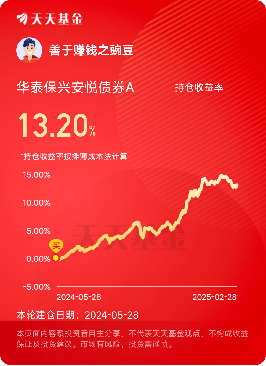 华泰保兴安悦债券我拿了很久了,长期收益跑赢同类均值,排名靠前,净值又要创新高了。#晒收益#