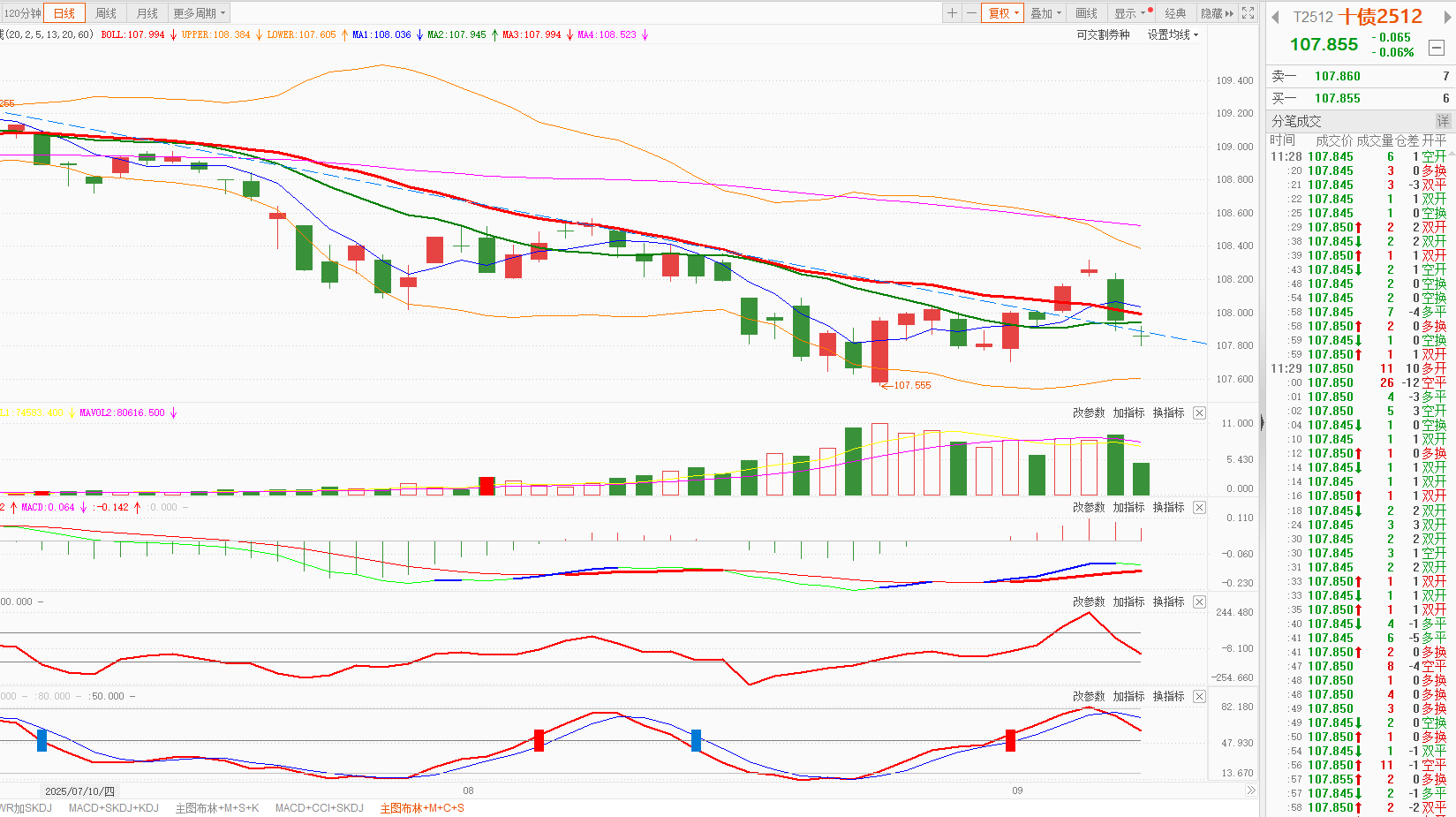 今天国债期货日K线收盘后全部在5、10、20日均线之下。整体走势偏弱。