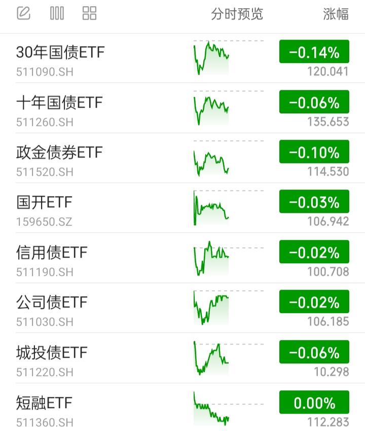 信用债ETF、公司债ETF、城投债ETF,代表信用债基。全部下跌