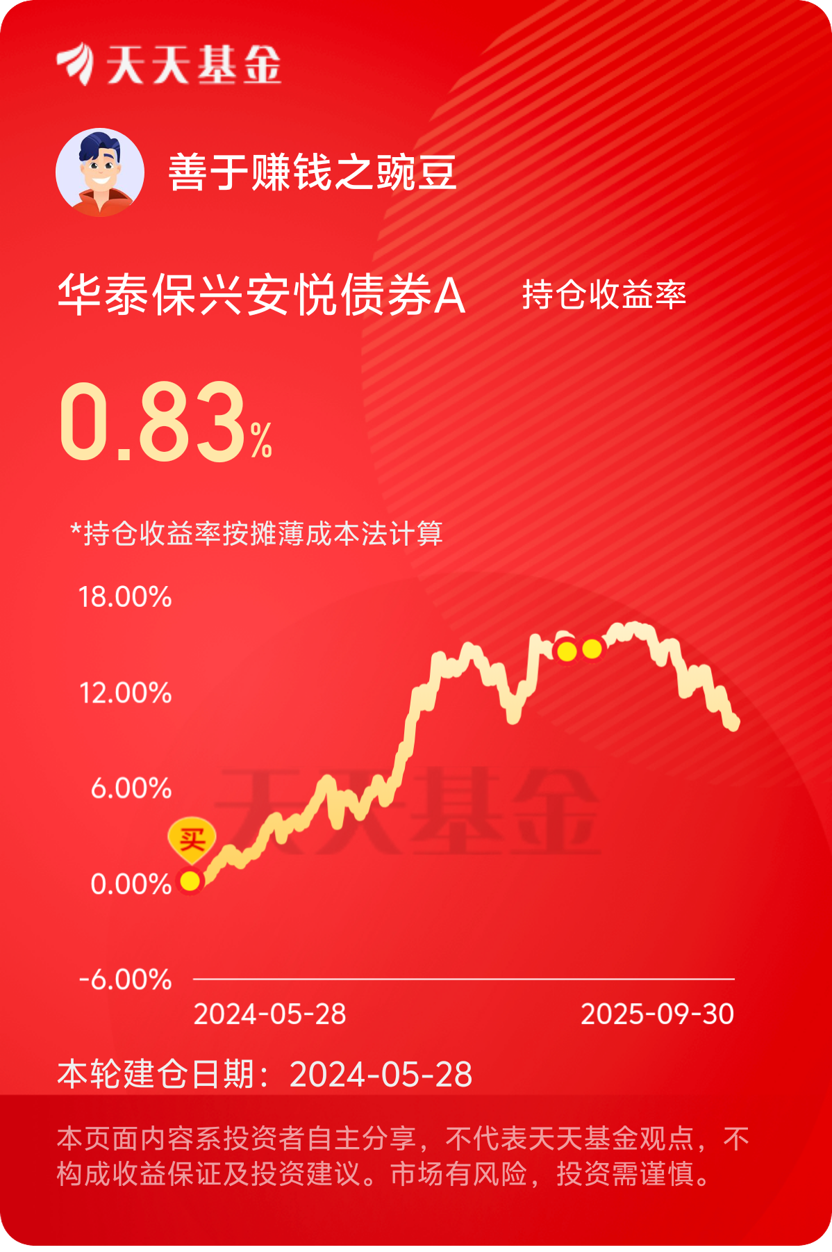 股市经常上窜下跳,还是要配置一些稳健的债基,华泰保兴安悦债券长期表现不错,继续加一些。#晒收益#
