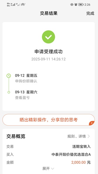 1.价值优选:我今天继续加仓$中泰开阳价值优选混合A(OTCFUND|007549)$2000元。这支基金是一支灵活配置型混合基金。基金经理擅长通过产业链研究挖掘低估优质个股,坚持质价双优布局。管理层深度推进行业反内卷政策,本基金受益供给侧改革。均衡布局芯片半导体,白酒、建筑材料、基础化工等行业,近1年涨44.34%,近6月涨9.52%,近3月涨14.44%,近1月涨10.42%,近1周涨0.47%,各时间周期表现都不错。今天A股三大指数集体发力上攻,成交量也再次明显放大,尤其是科技成长赛道,反弹信号非常,我认为是二次进场布局的好时机。本基金均衡布局,精选个股,严控回撤的风格,属于能打能扛的优质产品,坚持中长期安心持有,体验感非常不错,我非常喜欢,今天决定继续加仓它。下面我晒一下买入操作记录: