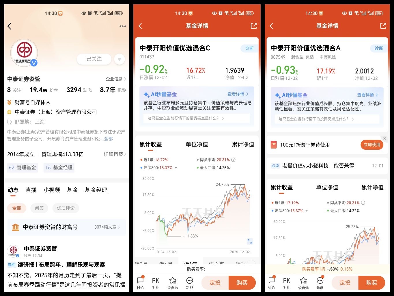 $中泰开阳价值优选混合A$中泰开阳价值优选混合A之所以值得购买,核心在于其均衡持仓适配震荡市、基金经理投资能力出众、长期业绩亮眼且产品特性友好,具体原因如下: 1. 持仓均衡攻守兼备 :它的重仓股覆盖建材、半导体、白酒、航空等低相关性行业,既有白酒这类稳健资产抗跌,又有半导体等成长标的捕捉科技风口。这种布局能应对市场“电风扇”式轮动,避免单押单一赛道的踏空风险,适配不同市场风格。2. 基金经理投资逻辑成熟 :基金经理田瑀有9年投研经历,秉持“质价双优”策略,专注挖掘“长坡、厚雪、慢变”的优质企业。他不仅早于市场很多人研究AI产业链,还精准把握高端白酒的买卖时机,在标的估值合适时逆势买入,估值过高时果断卖出,投资决策极具专业性。3. 长期收益优势显著 :截至2025年12月2日,该基金成立以来累计回报达108.10%,远超同期业绩比较基准的20.68%;近6个月涨幅19.45%,近12个月涨幅17.19%,过往长期业绩能给投资者较强的收益信心,且曾有过近1年最大回撤12天快速修复的表现,抗跌与修复能力突出。4. 产品适配普通投资者 :它的规模稳定在15亿元左右,既不像大规模基金调仓受限,也不会像小规模基金易受申赎影响,调仓灵活高效。同时费率适中,适配上班族长期定投,且背靠中泰证券资管,有专业投研团队提供支撑,进一步保障投资运作的稳定性。#机构:看好“春季行情”提前开启# #12月基金投资策略# #12月你看好哪条投资主线?# #今年你的投资目标达成了吗?# #低估补涨号启航# #青禾创作计划#