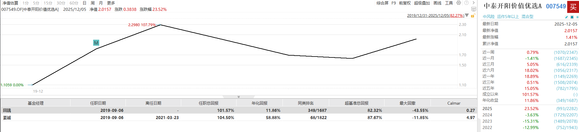 他掌舵的中泰开阳价值优选混合A(007549)2025年内上涨了23.52%,自2019年9月6日开始任职以来,累计回报101.57%,年化回报率为11.86%,居同类基金前21%,期间最大回撤43.55%,卡玛比值0.27。