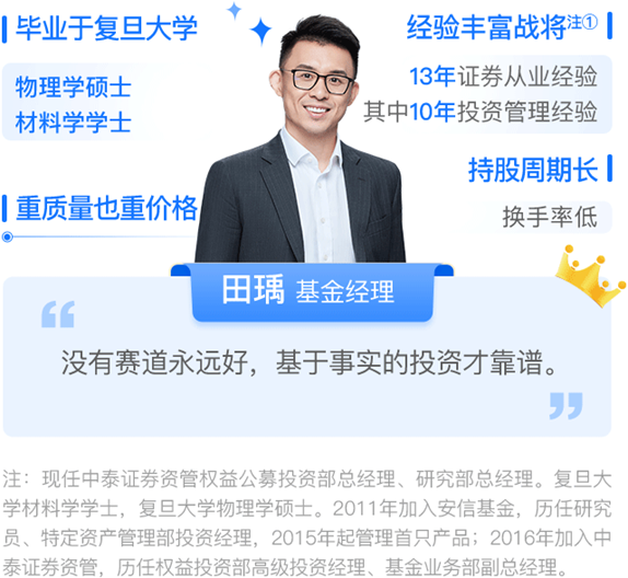 中泰开阳的价值投资之路,是一条看似平淡却足以行稳致远的道路,在未来的市场征程中,我们有理由相信,坚持这一理念的田瑀将继续为持有人挖掘更多跨越新旧经济界限的投资瑰宝,持续创造长期优异的回报。