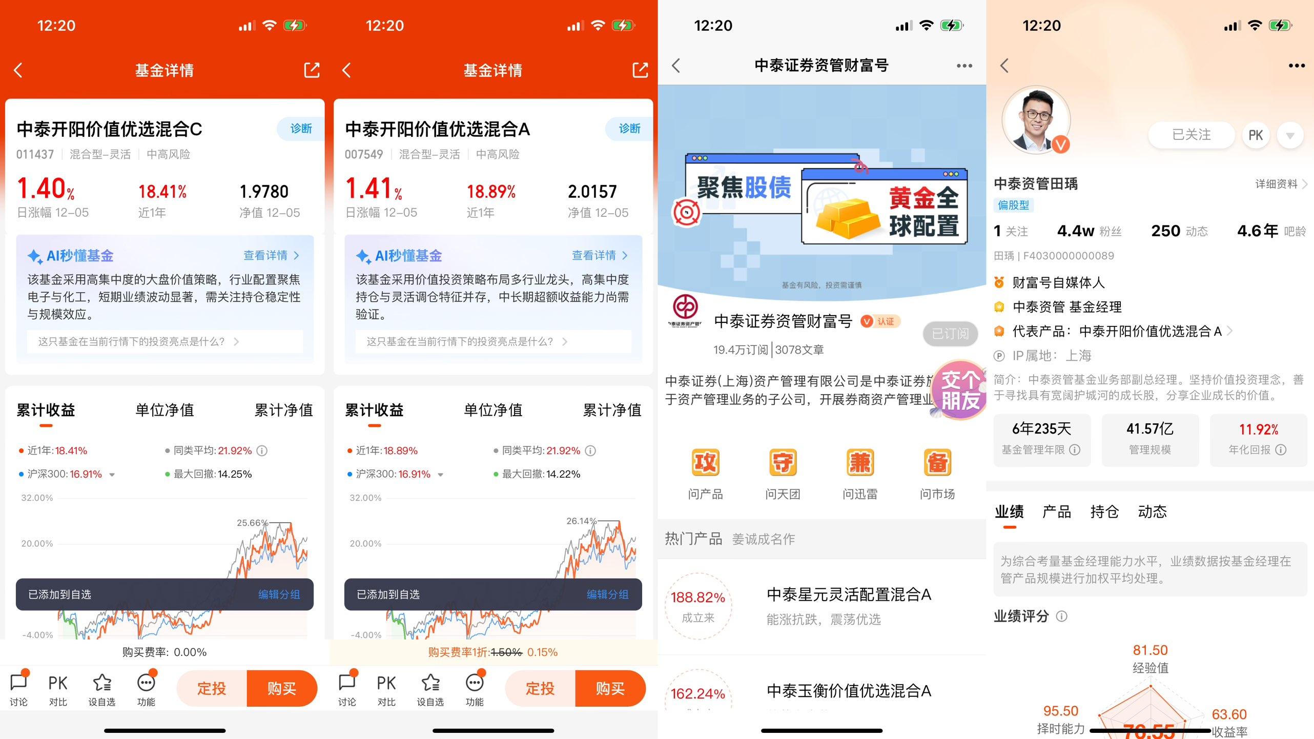 中泰证券资管旗下的几只价值基金是我一直较为关注和看好的公募基金,一直以来以稳健著称,今天有幸参与天天基金组织的调研活动,调研的就是自2019年9月成立以来历经熊市却创造了+11.87%年化收益的$中泰开阳价值优选混合A(OTCFUND|007549)$ 基金经理田瑀,且今年以来收益高达+23.52%的价值基金。