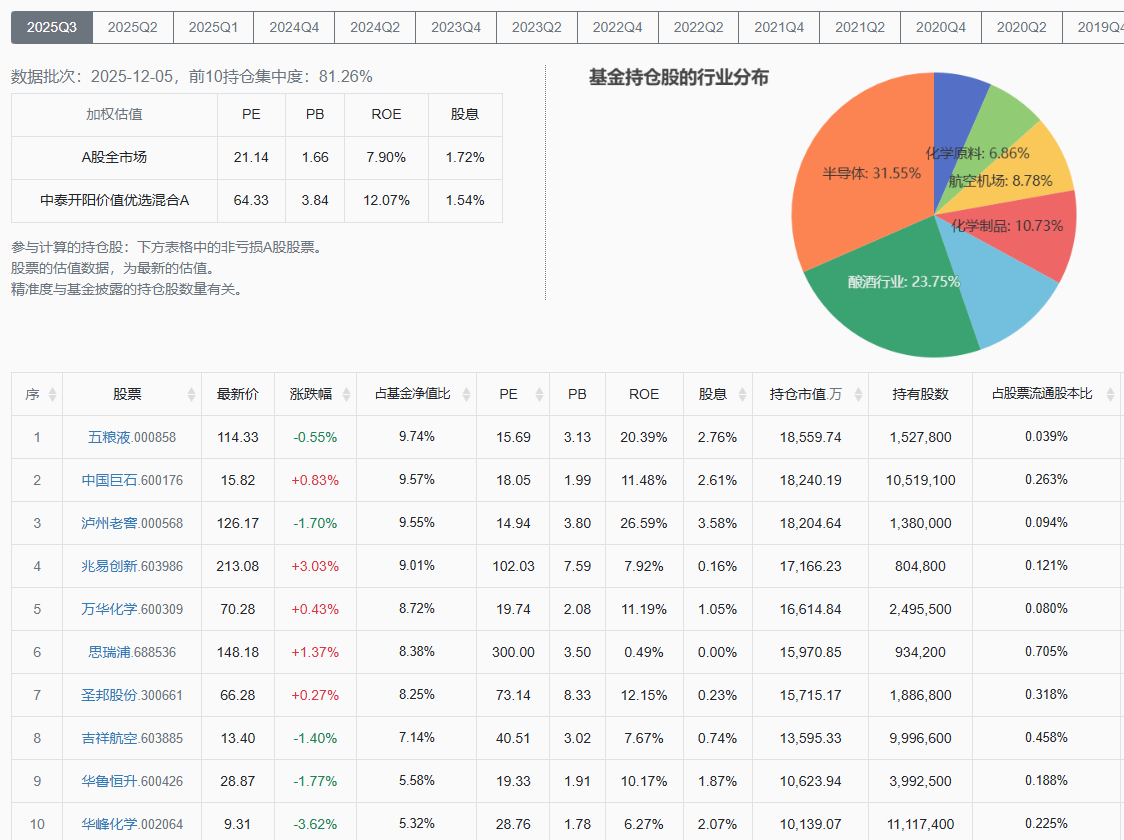但他强调,这并不意味着所有科技企业都无法评估。对于他们团队能够看懂、能拆解清楚其技术、产品、客户诉求及竞争优势的科技企业,他们会毫不犹豫地按照价值投资的原则进行配置。中泰开阳持仓中同时出现白酒、化工和半导体,并非刻意平衡,而是自下而上扫描全市场后,那些符合“价格低于价值”标准的标的自然进入组合的结果。他们只是在科技领域中寻找那些自己能评估、估值合理且潜在回报高的标的,而对于估值过高或无法理解的企业,则敬而远之。