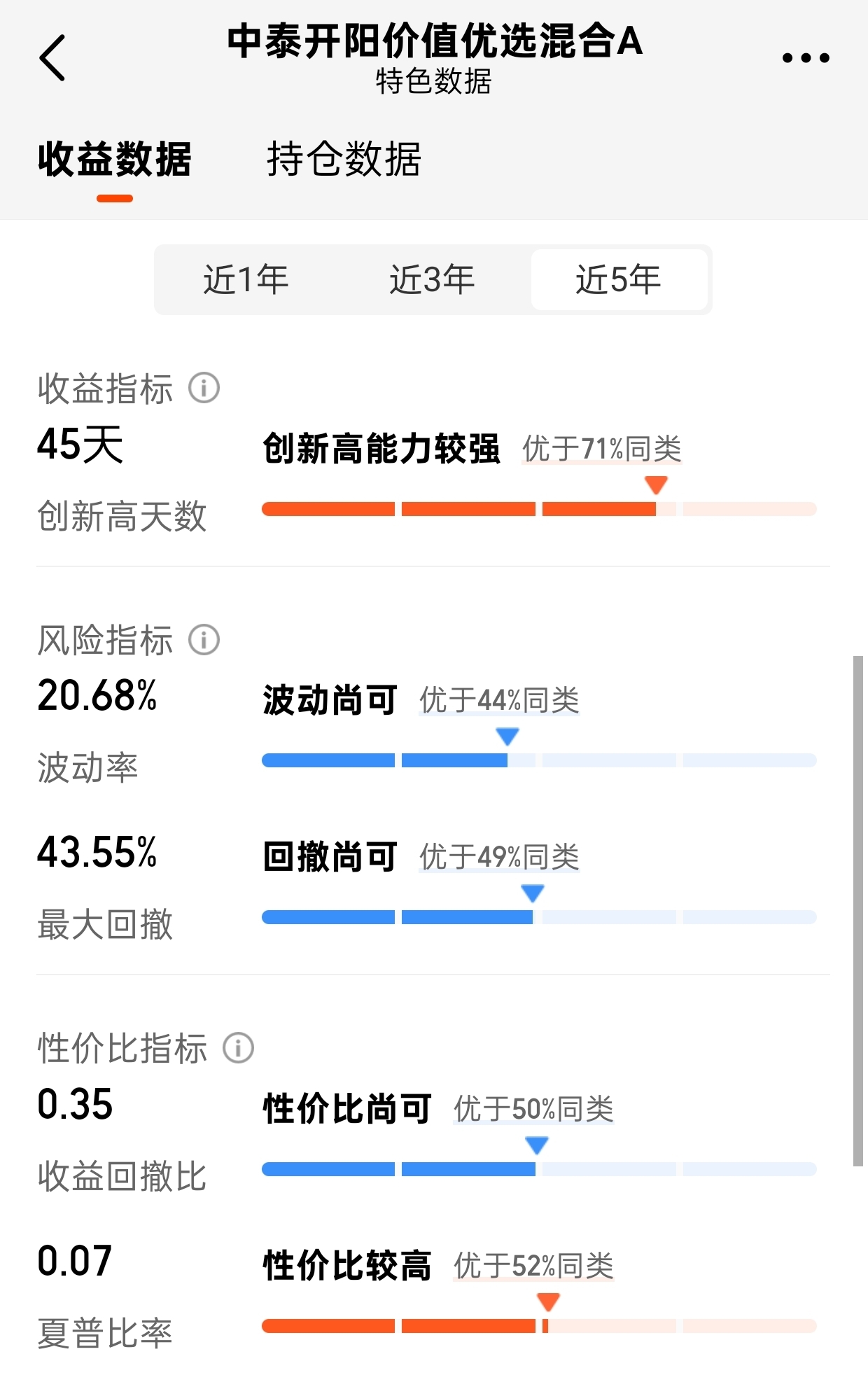 田瑀的投资风格坚持自下而上选股,将“企业护城河足够宽”作为选股第一原则,摒弃自上而下的行业预判。这种风格使得其管理的基金在市场波动中展现出较强的抗风险能力,中泰开阳近五年创新高能力优于71%的同类,最大回撤优于49%的同类,夏普比率为0.07,优于52%的同类。