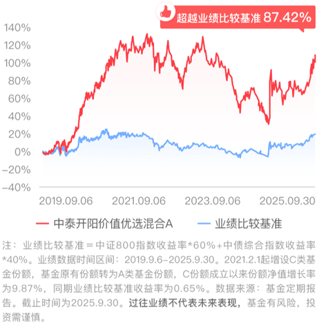 田经理是价值投资管理人,管理经营丰富,择时能力强,善于寻找具有宽阔护城河的成长股,管理该基金6年多的时间,任职回报率高达101.57%,管理团队始终把长期稳定的超额收益做为配置资产的关键核心要素,在当前小登老登频繁轮动,市场行情跌宕起伏波动频繁,追求长期稳定的超额收益我选择中泰开阳价值优选混合基金。