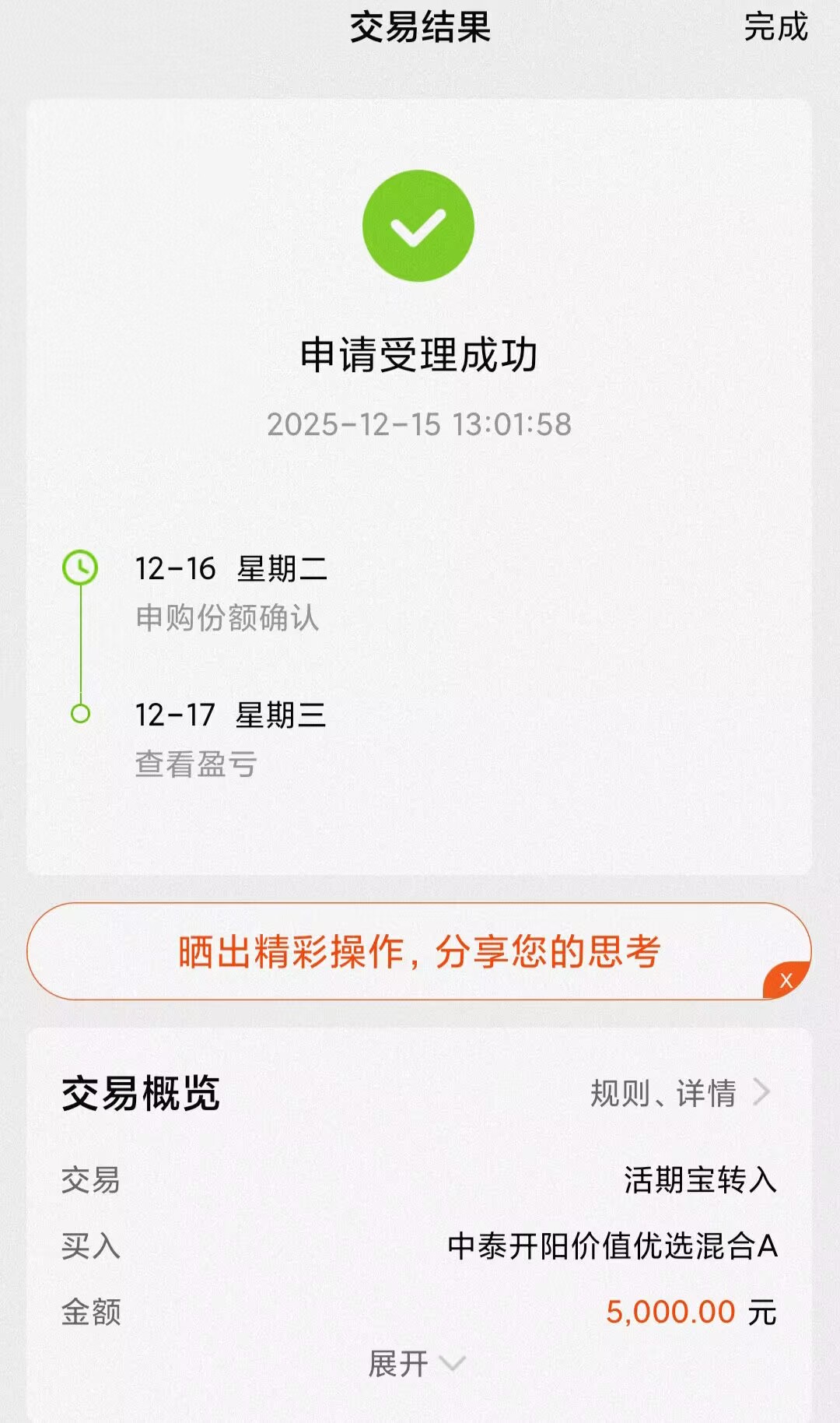 加仓5000元$中泰开阳价值优选混合A(OTCFUND|007549)$大盘低开震荡,令不少人有些担心,不过市场热点依旧不少,尤其是化工、白酒拉升较为明显,而该基金采取的是自下而上的价值选股策略,在田经理眼中,能评估价值的领域都是价值投资的范围,因此不仅包含了传统老登股,还有小登科技,目前看重仓股中的化工股和白酒股涨幅较好,预计今天继续盈利,有望带给我惊喜。