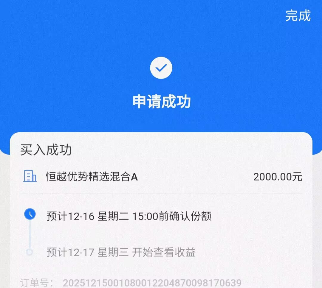 加仓2000元 $恒越优势精选混合A(OTCFUND|011815)$,该基金长期聚焦科技赛道,并且换手率较高,弹性比较大,本轮科技牛市已经十分明显,主线在科技细分赛道来回切换,从年初机器人到2季度算力,再到三季度芯片,最近一段时间CPO又疯狂上涨,该基金的经理紧跟市场热点,也使得该基金在本轮牛市中表现十分亮眼,上周大涨3.86%,今年以来累计上涨142.38%,超额收益十分明显。