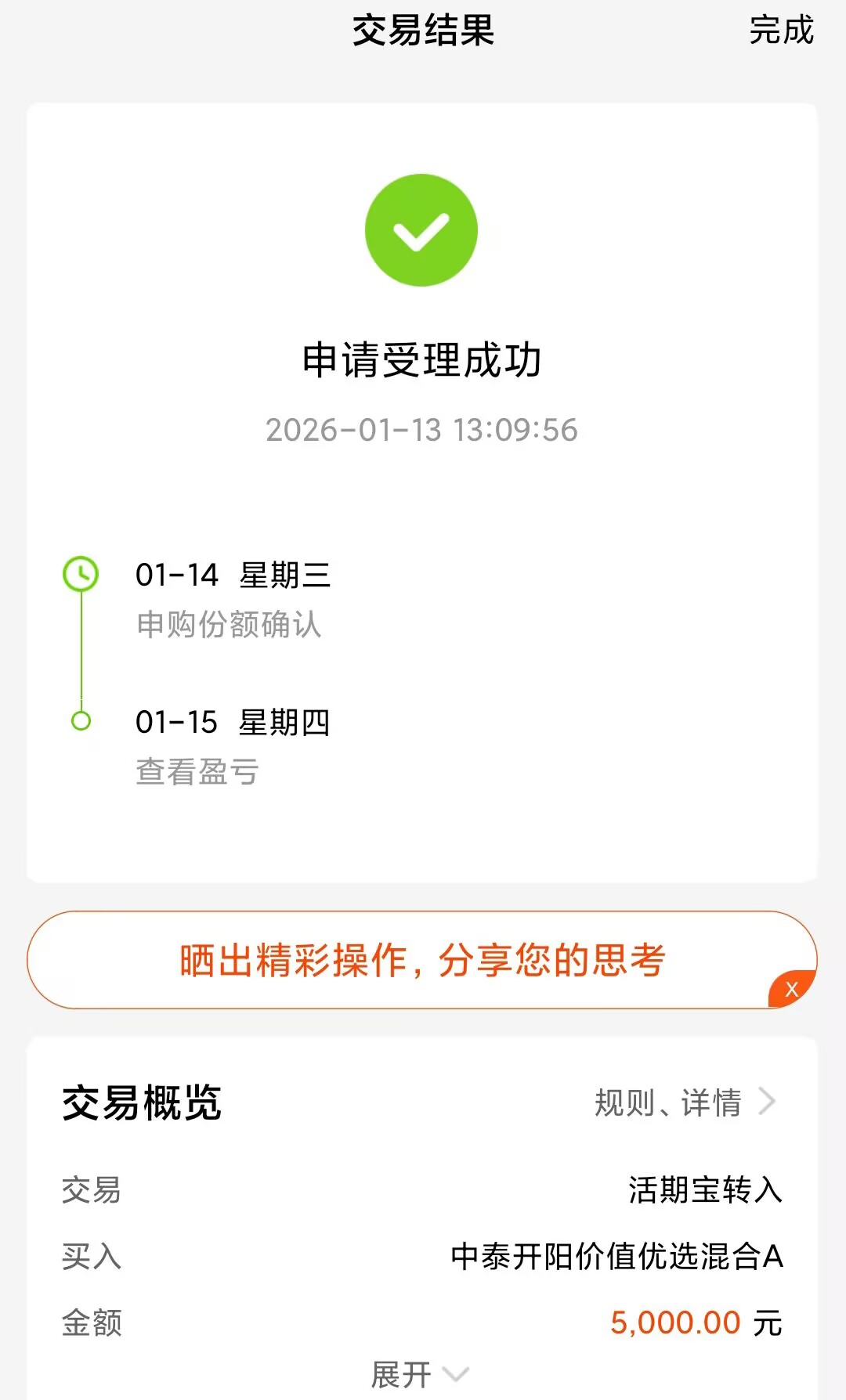 加仓5000元$中泰开阳价值优选混合A(OTCFUND|007549)$ 春季躁动行情开启,大盘最近持续向上拉升,该基金近期表现也是不错,近一个月收益8.94%,今年以来短短几个交易日涨幅3.67%,我在最近持续布局,也赚了3000多块。上证指数已经连续17连阳,这个时候短线走势很难判断,尤其是之前疯狂上涨的商业航天、军工回落明显,让人有些担心, 但是该基金基本不受影响,今天稳中有升,有望正收益。