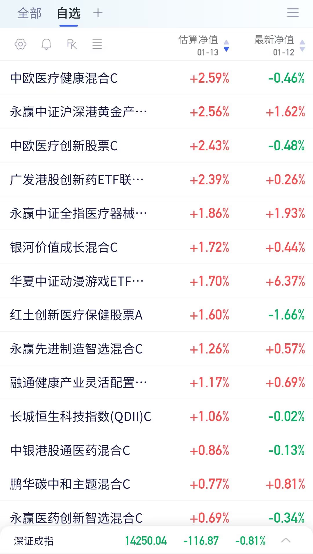 以下是部分自选基金当日收益估算(1:35分左右数据):