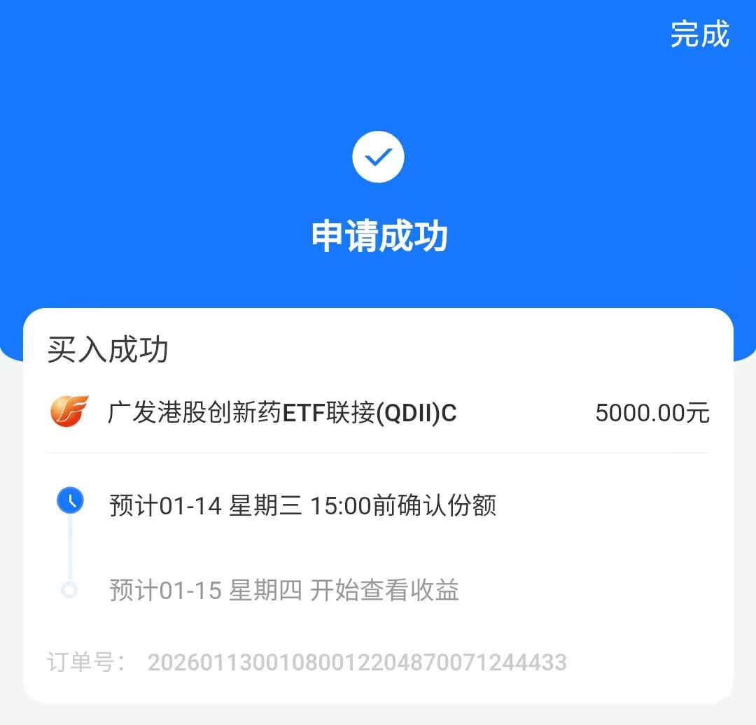 加仓5000元$$广发港股创新药ETF联接(QDII)C(OTCFUND|019671)$ 商业航天和军工倒下了,医药起来了,今天医药全面上涨,尤其是港股创新药涨幅明显,药明康德、三生制药涨幅在7%左右,板块涨幅超3%,而该基金就是全部持仓港股创新药,弹性比较大,爆发力强。