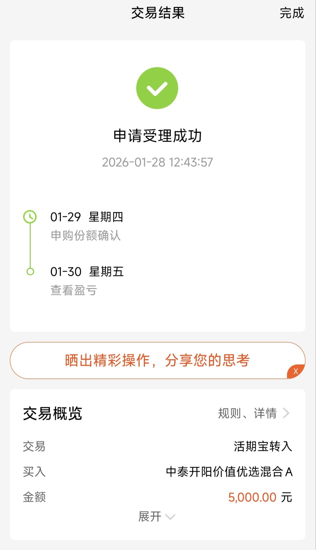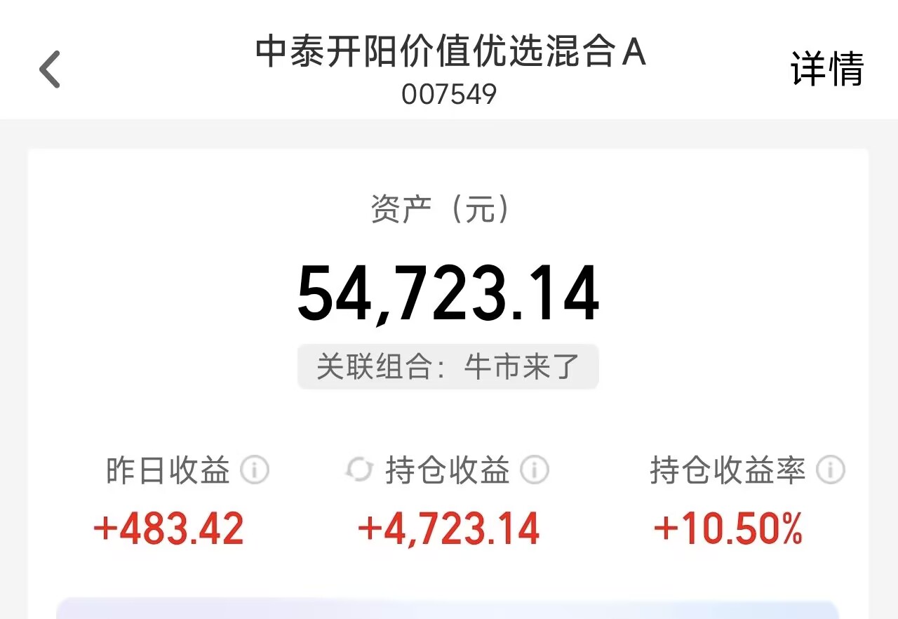 加仓5000元$中泰开阳价值优选混合A(OTCFUND|007549)$ 最近一段时间大盘走势非常反复,但是该基金表现却是非常稳健,今年不到一个月,该基金累计收益已经达到了8%,我在去年11月份开始持续布局,目前收益已经超过了10%,不断刷新我的收益新高,反正从我开始入手的这几个月的感受来看,该基金涨得好,相对大盘指数超额收益明显,并且回撤还比较小,拿来当做大底仓躺赢行情最合适不过。
